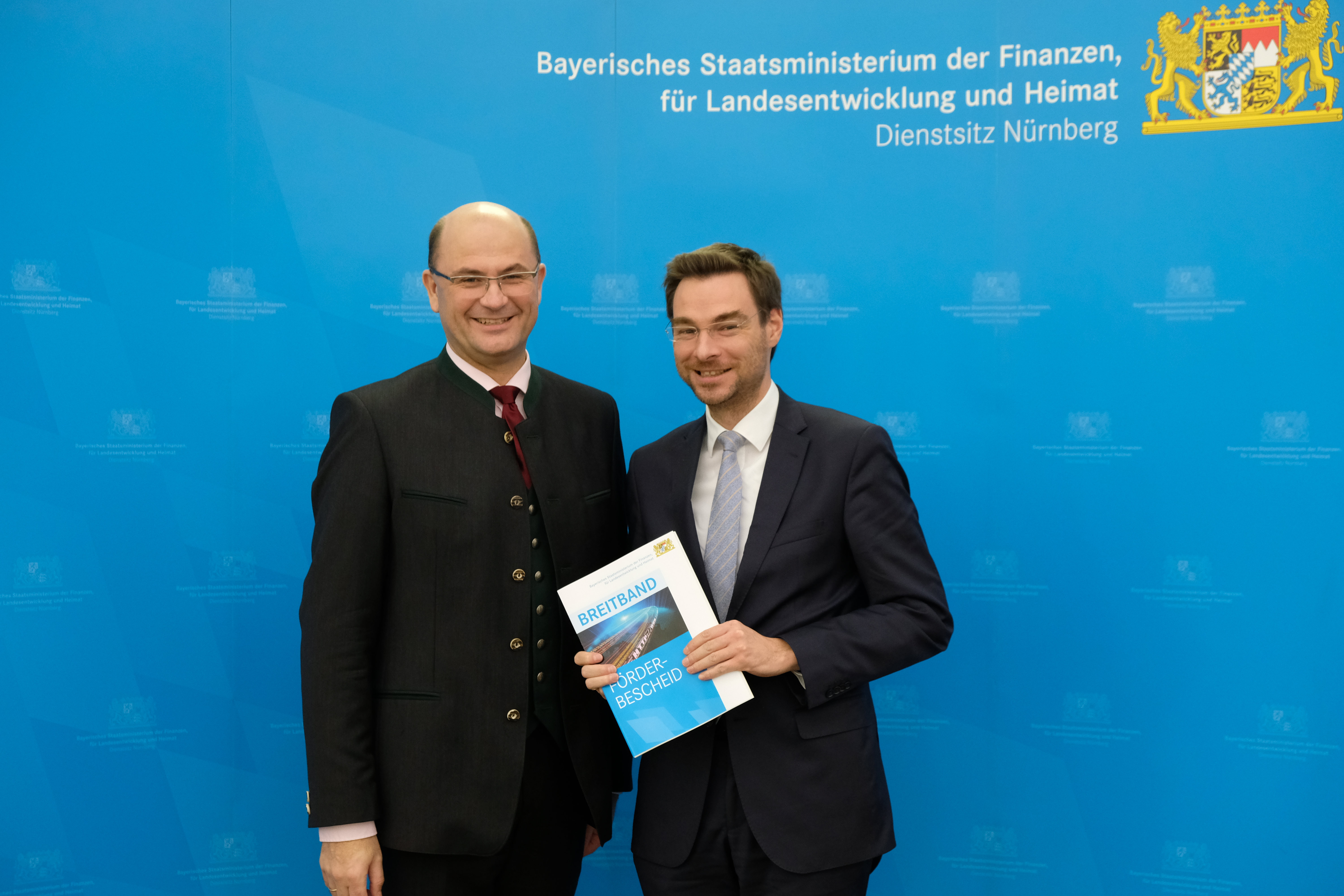 Die Arbeiten am ersten Abschnitt des Breitbandausbaus sind abgeschlossen, nun hat der Markt Mantel für den zweiten Durchlauf des Bayerischen Förderprogramms für Breitbandausbau einen Förderbescheid erhalten. Erster Bürgermeister Dr. Stephan Oetzinger konnte den Bescheid am Nürnberger Dienstsitz des Heimatministeriums von Staatssekretär Albert Füracker persönlich in Empfang nehmen. Der Zweite Durchlauf durch das Verfahren soll durch die Deutsche Telekom durchgeführt werden, die Wirtschaftlichkeitslücke beläuft sich auf 145.360 Euro, wovon der Markt Mantel einen Zuschuss in Höhe von 90 Prozent, d. h. 130.824 Euro erhält. Bei diesem zweiten Durchlauf werden Glasphaseranschlüsse direkt bis in die Anwesen verlegt. Angebunden werden dabei der Bereich Turnhallesiedlung, insbesondere das dortige Gewerbegebiet, das Kellerhaus sowie das Kalkhäusl und die Firma Saglik. Mit einer Fertigstellung ist bis Mitte 2018 zu rechnen. Wie Rathauschef Oetzinger ausführte, sind durch den ersten Durchlauf durch das bayerische Breitbandförderprogramm all die Bereiche im Ortsgebiet Mantel sowie Rupprechtsreuth an schnelles Internet angebunden worden, die bisher keine Versorgung von mehr als 30 MBit hatten. Ausgenommen aus der Förderung sind all die Gebiete im Ort, in denen ein anderer Anbieter wie beispielsweise Kabeldeutschland, Bandbreiten von mehr als 30 MBit zur Verfügung stellen.