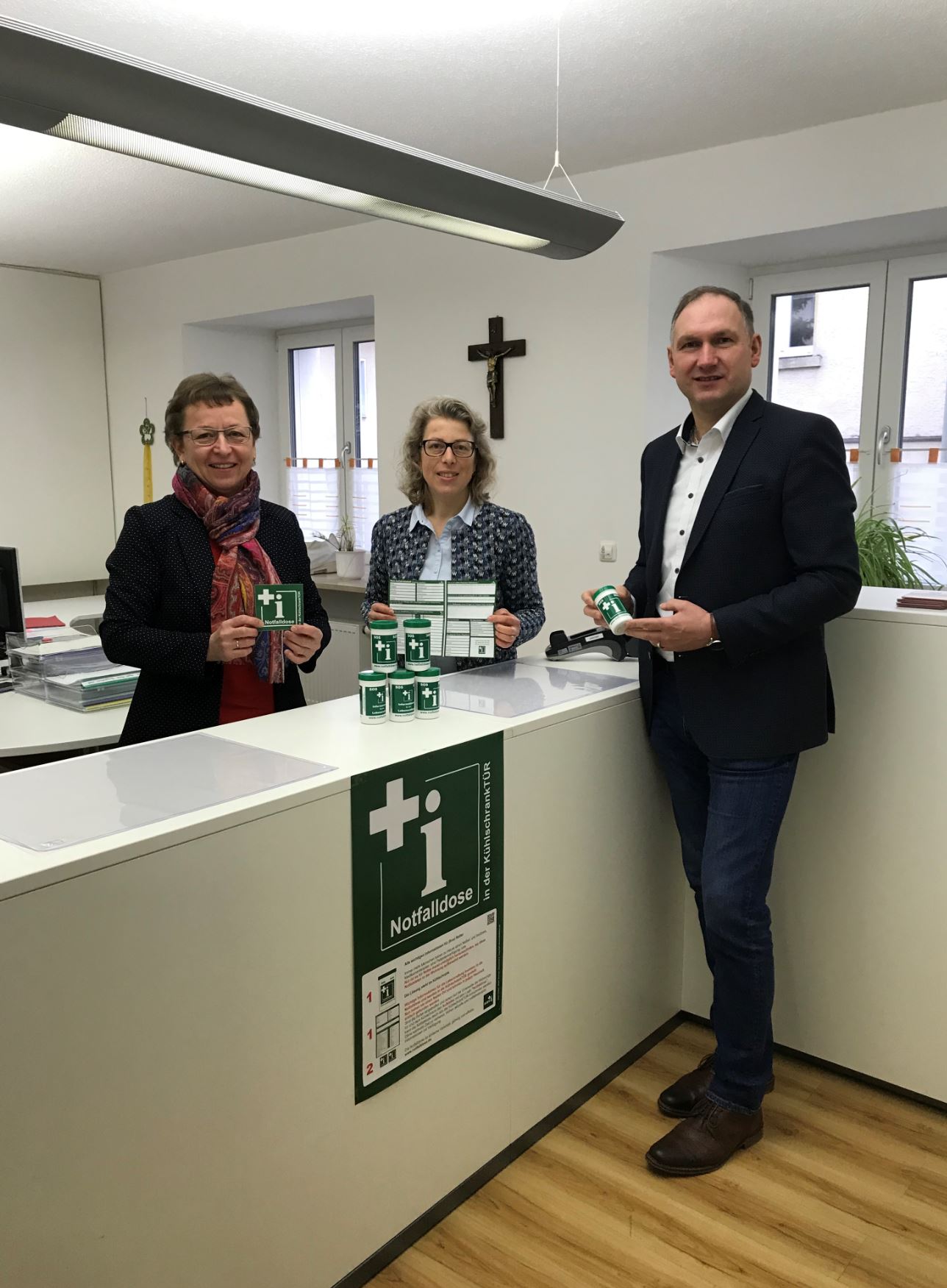 In der Marktratssitzung am 04.02.2020 wurde auf Antrag der CSU Fraktion der Beschluss gefasst, Notfalldosen anzuschaffen und an Senioren über 65 Jahren kostenlos auszugeben. Bürgermeister Richard Kammerer freut sich mit den beiden Kassenverwalterinnen Monika Puff und Renate Hofmann, dass die Dosen bereits eingetroffen sind und diese im Ernstfall Leben retten können.