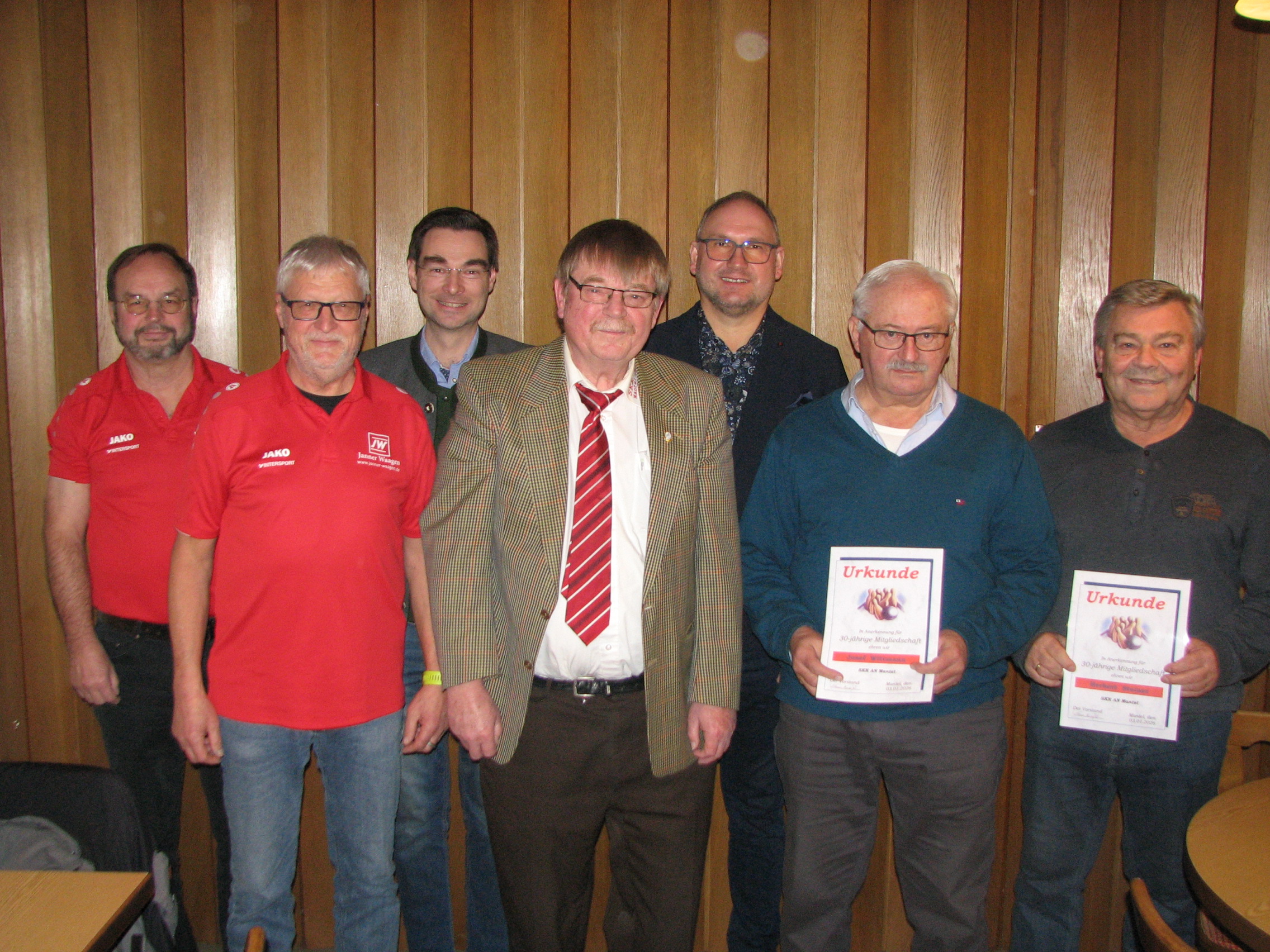 Landtagsabgeordneter Stephan Oetzinger (3. von links) und Bürgermeister Richard Kammerer (5. von links) gratulierten den Geehrten zu ihren Auszeichnungen und wünschten dem Kegelklub viel Glück in ihrer neuen Kegelheimat.