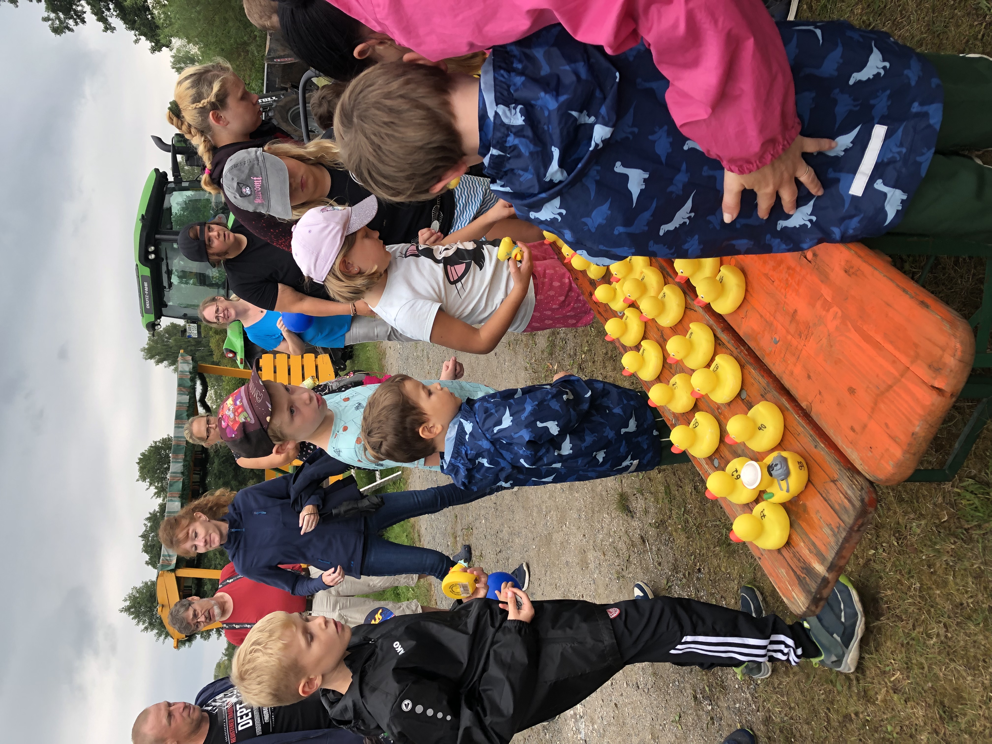 Leider ließen sich wohl einige Familien vom Regen zu Beginn des Ferienprogrammes am Samstag um 14 Uhr abhalten. Es waren leider nur 20 Kinder zum alten Festplatz an der Naab gekommen. Der Regen hörte dann auf und die Kinder hatten ihren Spaß. Zuerst drehten sie einige Runden mit dem Manteler Bockl mit Lokführer Herbert Steiner und Schaffner Lukas Bogner. Mit großem Eifer wurden dann die Rennenten ausgesucht, die für die Kinder an den Start gehen sollten. Friedrich Janner hatte mit seinem Team mit Anita Günther und weiteren Helfern für Kaffee für die Eltern und Erfrischungsgetränke für alle gesorgt. Es gab Brezen, Wurstsemmeln und auch süßes Kleingebäck. Mit dem Zug fuhren dann die Kinder die Haidenaab entlang und Christian Günther ließ die Entenschaar ins Wasser plumpsen. Stefan Lippik sorgte mit dem Standup Board dafür, dass keine Ente irgendwo hängenblieb. Während die Entchen schwammen, baute Anita Günther die von der FWG gekauften Preise auf. Es gab Rucksack, Spiele, Kopfhörer, Bastelsets, Zauberwürfel und vieles mehr. Mit Spannung warteten dann die Kinder mit Eltern an der Ziellinie auf die Enten. In der Reihenfolge wie die Enten nach Nummern eintrudelten durften sich die Kinder dann ihre Preise aussuchen. Jedes Kind erhielt ein Geschenk. Platz eins belegte Levi Schreiber, gefolgt von Finn Lochner und Elisa Bogner. Platz vier erzielte Vince Fuhrmann und Platz fünr Conner Ackermann. Laura Janner verlas die Nummern in der eingegangenen Reihenfolge. Zum Ende des Nachmittags schien die Sonne und die Kinder drehten abschließend noch einmal eine Runde durch Mantel mit dem Zug.