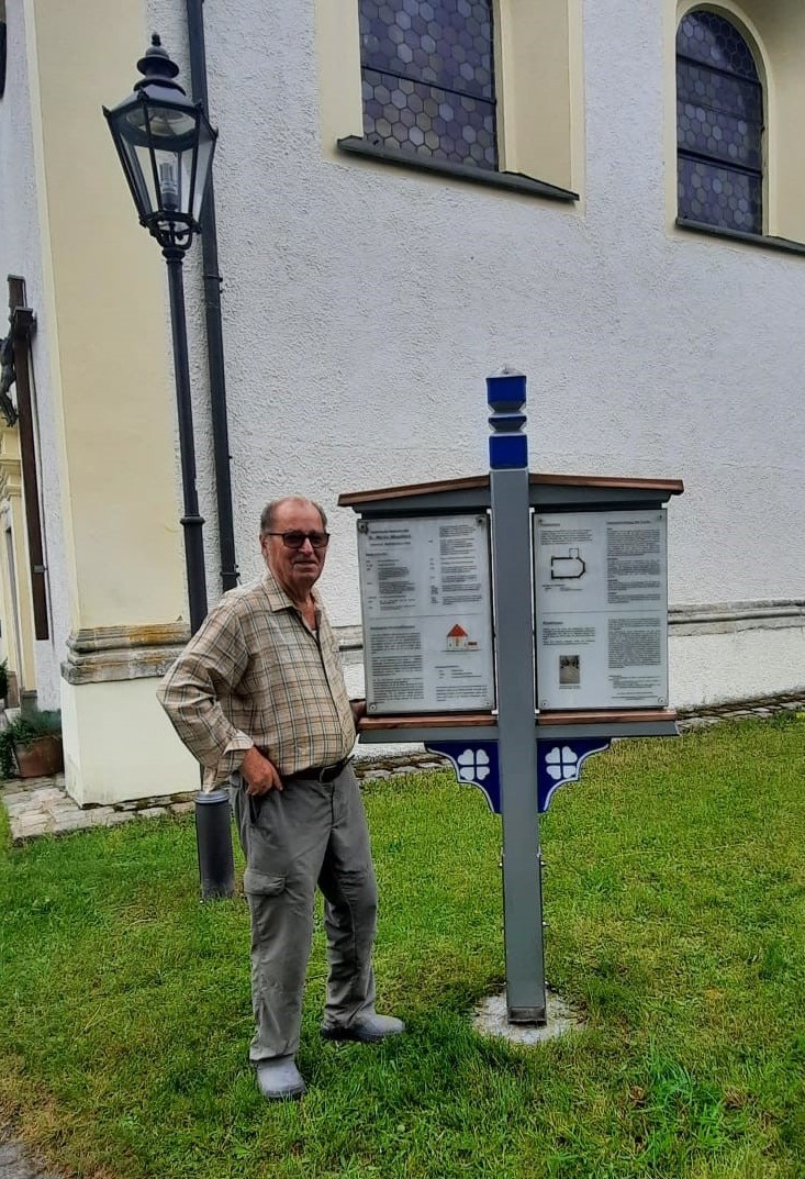 Dieser Arbeit nahm sich spontan Josef Rieder an. Der erfahrene "Holzwurm" sorgte für die notwendige Konservierung, mit Schleifpapier, Pinsel und Farben und das alles für ein Vergelt's Gott. So geschützt kann sie nun auch die nächsten Jahren dem Interessierten viel Wissenswertes über die St.-Moritz-Kirche erzählen.