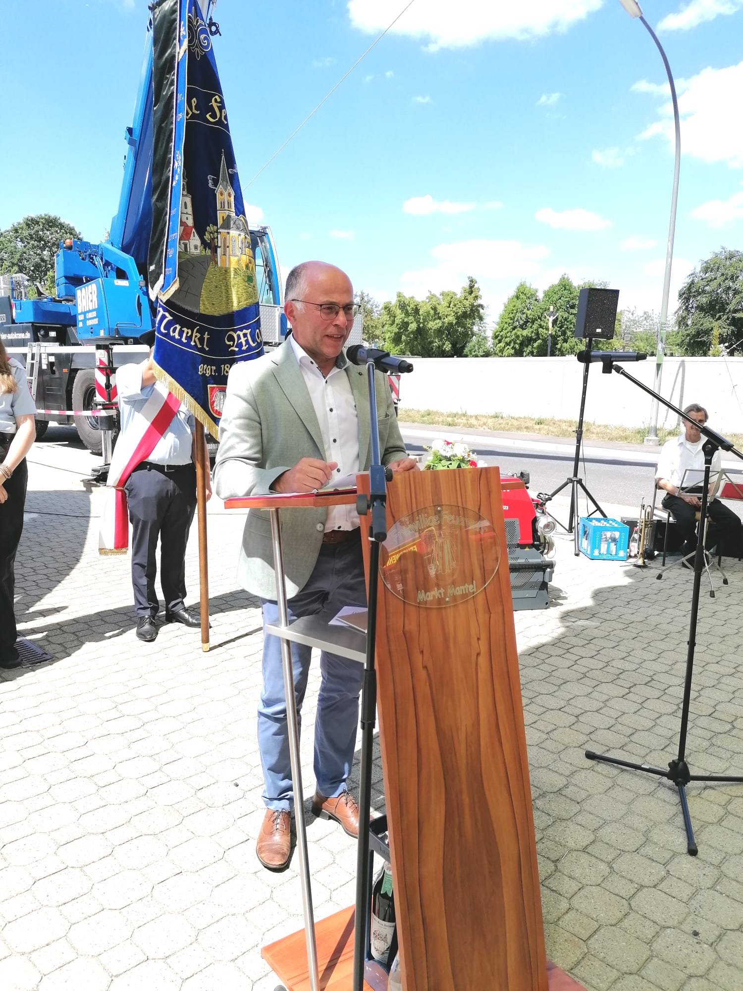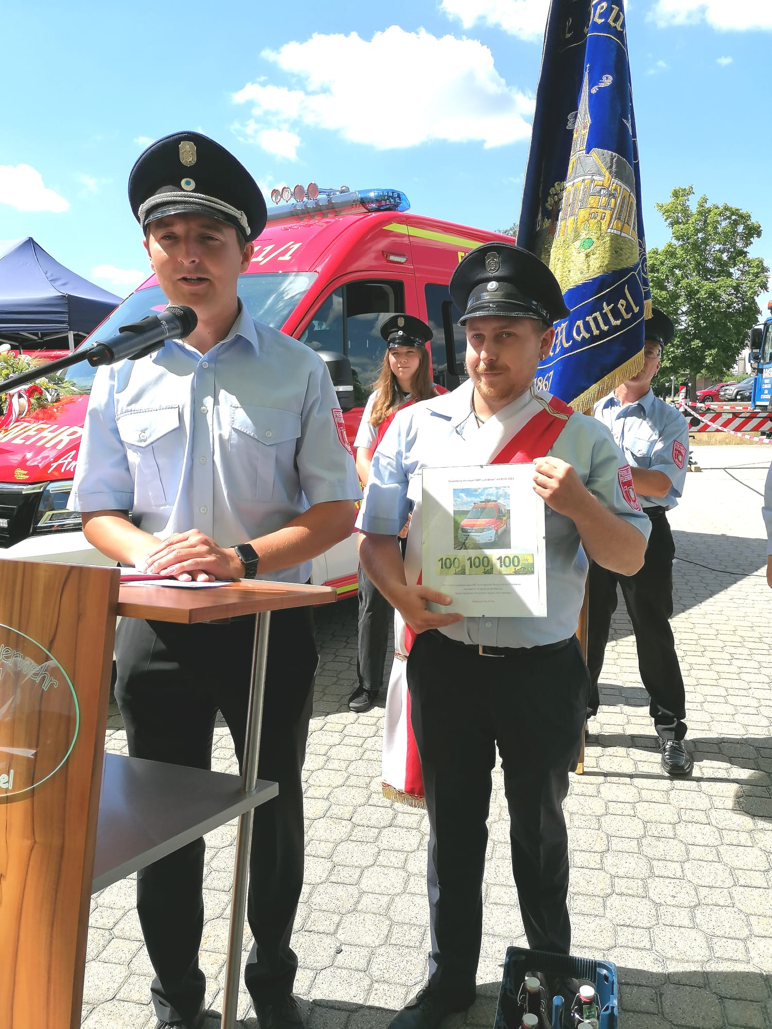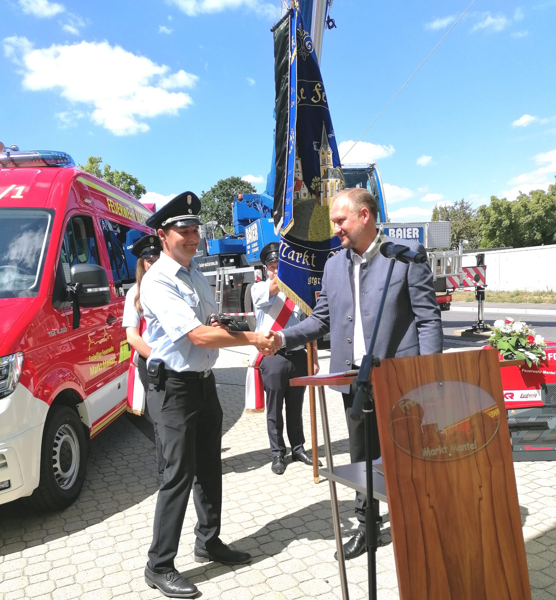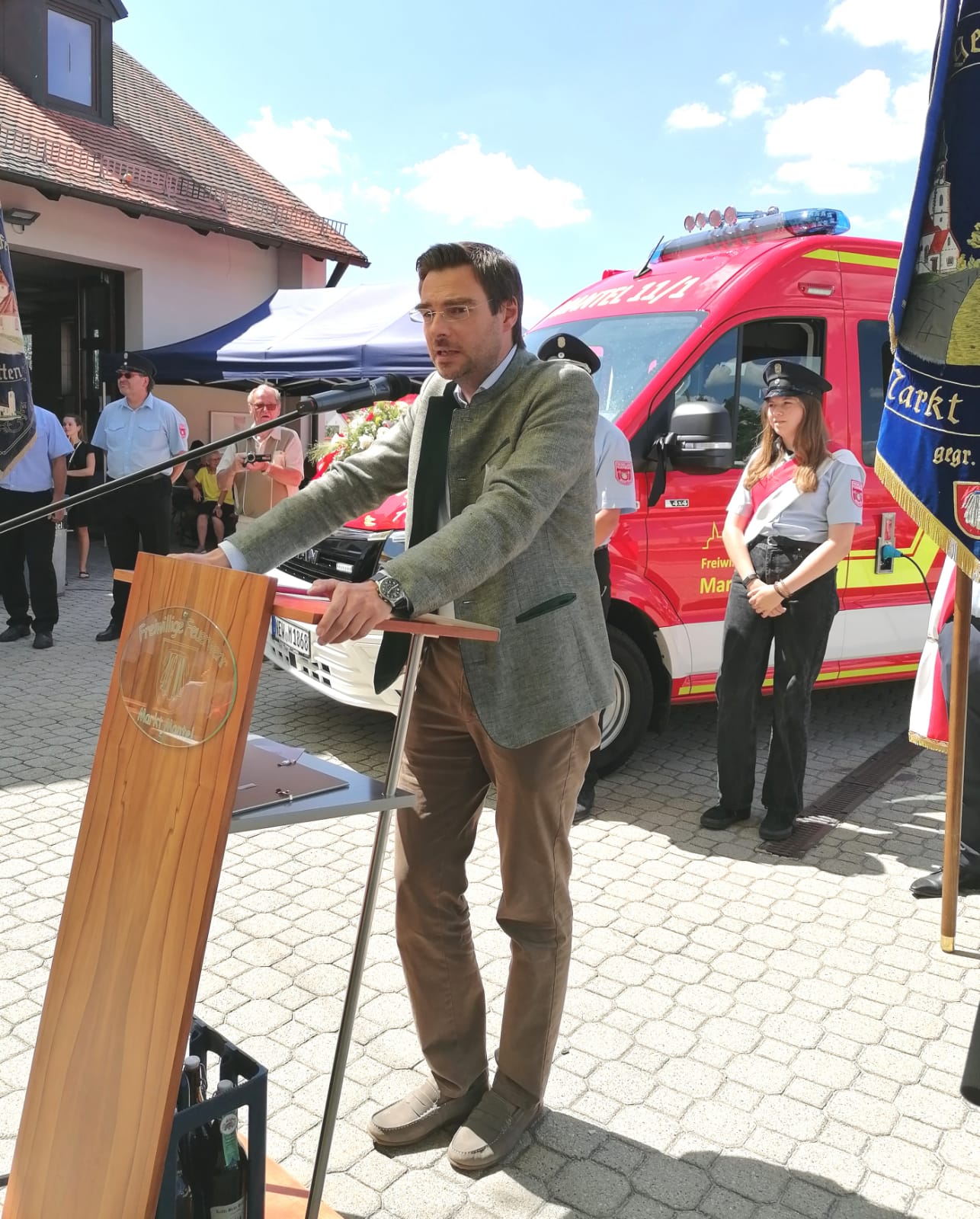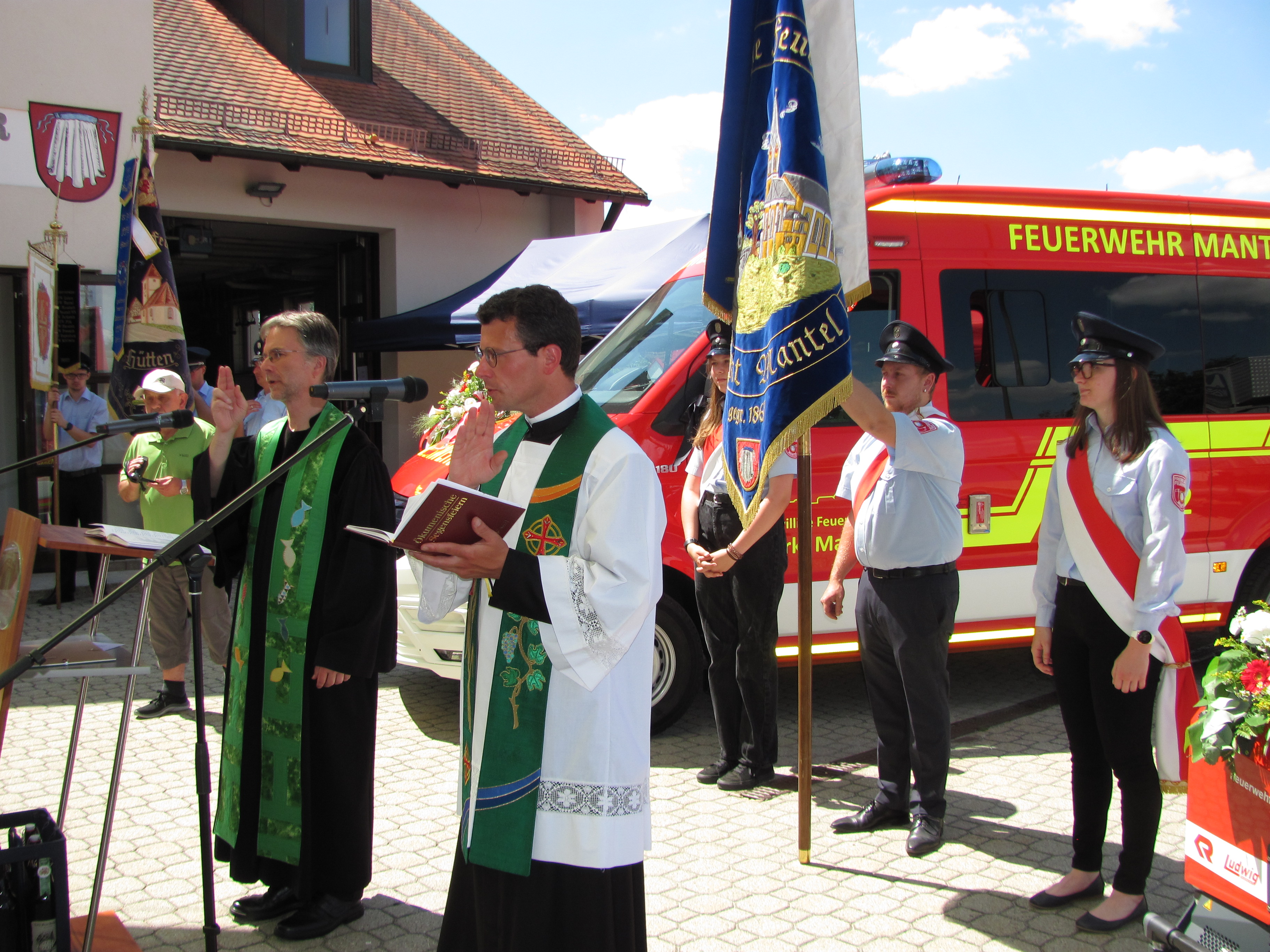Kommandant Timo Kraus ging erzählte, dass eine Beschaffungsgruppe insgesamt 175 ehrenamtliche Stunden investiert hatte um das richtige Fahrzeug mit der passenden Ausstattung zu finden. Nach dem positiven Marktratsbeschluss konnte nach nicht mal einem Jahr im Oktober 2022 das Fahrzeug in Empfang genommen werden. Das Fahrzeug wurde auf einem MAN TGE 4.180 4x4 mit Allrad aufgebaut. Es ist mit Notbremsassistenten, Seitenwindassistent und Rückfahrkamera ausgestattet. Es wurde so konzipiert dass es als Erstfahrzeug bei Einsätzen vorausfährt und der Einsatzleitung zur Verfügung steht mit moderner EDV-Ausstattung. Der Markt Mantel investierte 104.000 Euro in das Fahrzeug. Eingeweiht wurde auch eine neue Tragkraftspritze die 1.700 Liter Wasser in der Minute fördern kann. Hier entstanden Kosten von 15.500 Euro. Pfarrer Thomas Kohlhepp und Pfarrer Andreas Ruhs wiesen bei der Segnung von Auto und Spritze darauf hin, dass die Hilfeleistung der Feuerwehr nur im Team funktioniert. Da Andreas König noch in der Beschaffungsgruppe mitgearbeitet hatte, aber leider vor dem Eintreffen des Autos verstarb trägt es den Namen Andreas. Für ihn und alle anderen verstorbenen oder im Einsatz umgekommenen Feuerwehrleute gab es ein stilles Gedenken. Pfarrer Kohlhepp forderte zum Gebet auf für alle, die mit dem neuen Fahrzeug im Einsatz sind. Thomas Lindner, der Sohn von Andreas König überreichte eine Spende von 300 Euro für die Firma König Elektrotechnik. Bürgermeister Richard Kammerer übergab den Fahrzeugschlüssel an den Kommandanten. „Neue Herausforderungen müssen bewältigt werden. Das neue Mehrzweckfahrzeug ist ein Sicherheitsgewinn für die Manteler Bürgerinnen und Bürger. - Wir die Kommune können nur die Hardware, die Gerätschaften für die Feuerwehrleute stellen. Der Gemeinde ist die Sicherheit der Feuerwehr Kameradinnen und Kameraden höchstes Gebot. - Wichtig ist das alle wieder Gesund vom Einsatz zurück kommen. - Die Marktgemeinde unterstützt auch weiterhin die Feuerwehr“, so der Rathauschef. Kreisbrandrat Marco Saller lobte die hohe Qualität der Manteler Wehr und die gute Ausbildung der Truppe. MdL Dr Stephan Oetzinger erklärte, dass das Ehrenamt der Feuerwehren in Bayern unschätzbar wertvoll ist, was nicht zuletzt die Corona-Krise gezeigt habe. „Deshalb haben wir als Freistaat die beiden Anschaffungen für die Feuerwehr Mantel mit über 20.000 Euro unterstützt. Stellvertretender Landrat Albert Nickl bezeichnete die Manteler Feuerwehr als „Vorzeigewehr“ und überreichte eine Spende. Die Segnungsfeier wurde von der Stadtkapelle Grafenwühr musikalisch umrahmt und die Fahnenabordnungen der befreundeten Wehren boten ein festliches Bild. Am ganzen Sonntag herrschte reges Treiben auf dem Gelände beim Feuerwehrhaus. Die zahlreichen Gäste genossen Weißwurstfrühschoppen, Steaks, Bratwürste, Käse und Brezen zum Mittag, und Abendessen, gekühlte Getränke und Nachmittag Kaffee und Kuchen. Bei strahlendem Sonnenschein waren die Sitzplätze im Schatten begehrt. Die Kinder amüsierten sich in der Hüpfburg, im großen beschatteten Sandkasten oder zeigten ihre Geschicklichkeit am Spritzenhäuschen. Wie wichtig die Feuerwehr ist und auch die „Helfer vor Ort“ Haidenaabtal, wo auch viele Feuerwehrleute tätig sind, zeigte sich, als die Helfer und auch einige Feuerwehrleute noch während der Segnungfeier zu einem Hilfeeinsatz gerufen wurden.