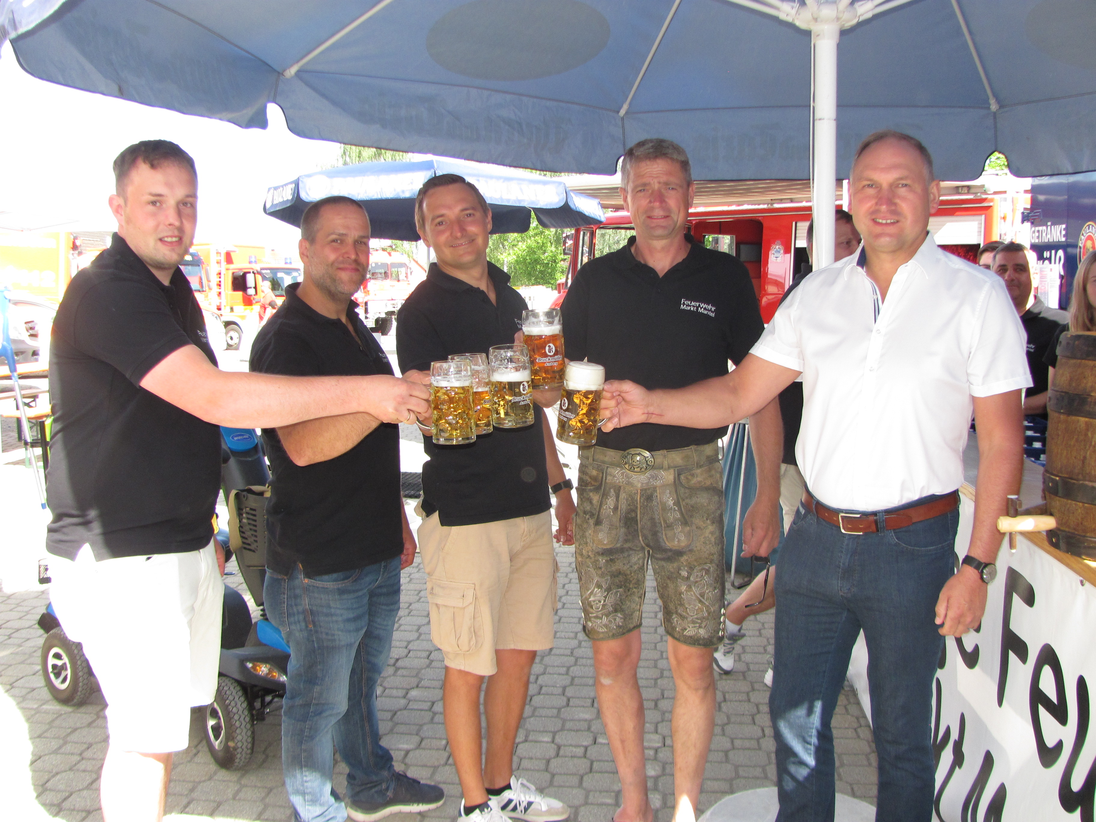 Das 155-jährige Gründungsjubiläum beging die Feuerwehr Mantel am Sonntag, 17.7. mit einem Tag der „Offenen Tür“. Schon zum Weißwurstfrühschoppen kamen die Gäste zahlreich. Bürgermeister Richard Kammerer zapfte pünktlich um 10 Uhr das erste Fass Festbier an. Viele Manteler Küchen blieben kalt, denn es gab beim Feuerwehrhaus Schweinebraten mit Knödel aus der Feldküche, der leckere Duft war weit über den Festplatz hinaus zu erschnuppern. Daneben wurden noch Steaks, Bratwurstsemmeln, Pommes oder Brezen mit Käse serviert. Überwältigend war auch das Tortenbüfett das die Damen bereitgestellt hatten. Simone Dobner hatte extra eine Jubiläumstorte gebacken. Immer belagert waren die Feuerwehrautos, die bei der Fahrzeugschau besichtigt werden konnten und auch ein Einsatzfahrzeug des BRK. Später standen Erwachsene und Kinder dann Schlange als die Feuerwehrautos ihre Rundfahrten durch Mantel machten. Für die Jüngsten gab es einen Parcours mit einem Mini-Feuerwehrauto, auch diese Touren waren heiß begehrt. Viel los war auch immer in der Hüpfburg, wo sich die Kinder austoben konnten, während die Eltern entspannt ein Bier oder Erfrischungsgetränke genießen konnten und auch Kaffee und Kuchen. An der Bar wurde auch „Hochprozentigeres“ ausgeschenkt, dies wurde meist erst am frühen Abend genossen. Ein großer Seiden-Fallschirm sorgte für Schatten. Der Festplatz vor dem Feuerwehrhaus war immer gut besucht. Viele Besucher bestätigten: „Wir wollen dieses Fest und auch die nächsten noch genießen“, weil wir befürchten, dass wir im Winter alle wieder eingesperrt werden, wenn die Corona-Zahlen weiter steigen. Die gesamte Feuerwehrmannschaft, auch die Jugend arbeitete harmonisch Hand in Hand, so dass alle Gäste schnell mit Essen und Getränken versorgt wurden, und die Autos drehten den ganzen Nachmittag ihre Runden. Demnächst steht die Sanierung und der Anbau des Feuerwehrhauses an.