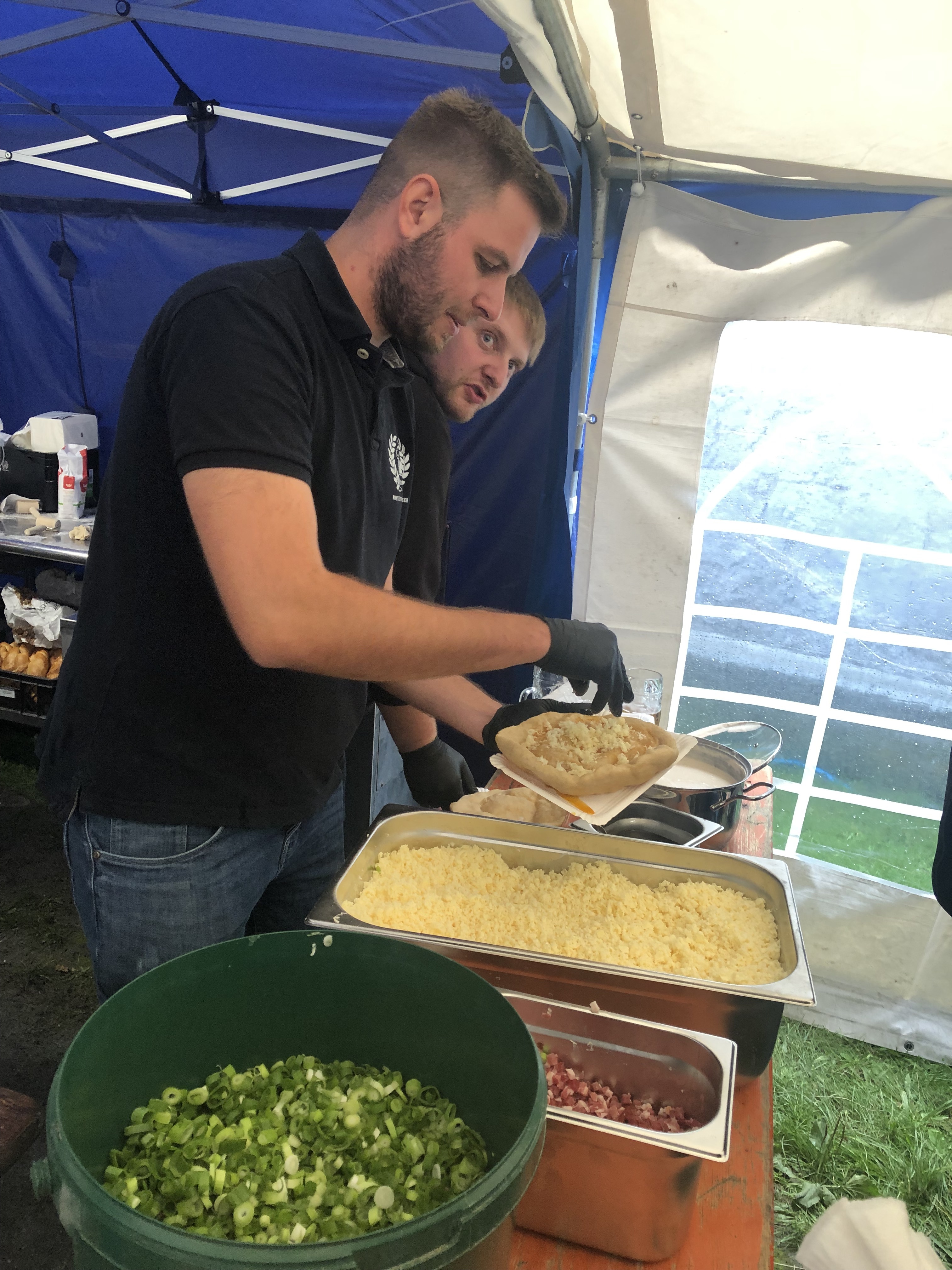 Selbst vom Regenwetter ließ sich der Mantler Stammtisch mit Vorsitzendem Manuel Prölss nicht entmutigen. Die Mitglieder stellten wie geplant an den Stodeln ein Festzelt auf und zogen ihren ungarischen Abend wie geplant durch. Der Stammtisch hat sich vor einigen Jahren gegründet und lädt zur Sommersonnwende zum großen Johannisfeuer als Familienfest ein. Auch ein Krautfest kam gut an. In diesem Jahr war Ungarn das kulinarische Reiseziel. Infos über Ungarn konnte man überall im Festzelt lesen. Getränke gab es natürlich auch. Aber begeistert waren die Gäste von der würzigen Gullaschsuppe, den Debrezinern im Stangerl und vor allem die „Langos“ die viele von den Balaton-Urlauben kennen fanden viele Abnehmer. Langos sind frittierte Hefeteigfladen und schmecken schon alleine mit Knoblauchcreme gut. Die traditionelle Variante ist die mit Knoblauchcreme oder Sauerrahm, geriebenem Käse, Räucherspeck und Zwiebeln oder Frühlingszwiebeln. Genau die gab es auch am Samstag in Mantel. Info: „Láng bedeutet Flamme und kommt daher, dass ursprünglich das aus Brotteig gemachte Lángos nicht frittiert sondern langsam über einer Flamme herausgebacken wurde. Auf vielen Weihnachtsmärkten gibt es die Lángos auch, oft auch in süßer Variante mit Pflaumenmus. Das Zelt war geheizt und die meisten Gäste hatten sich mit Stiefeln gut gegen die Nässe von unten geschützt. Die Bar befand sich in einer an das Zelt angrenzenden Scheune und wer wollte konnte sich auch mit etwas „Hochprozentigem“ aufwärmen.