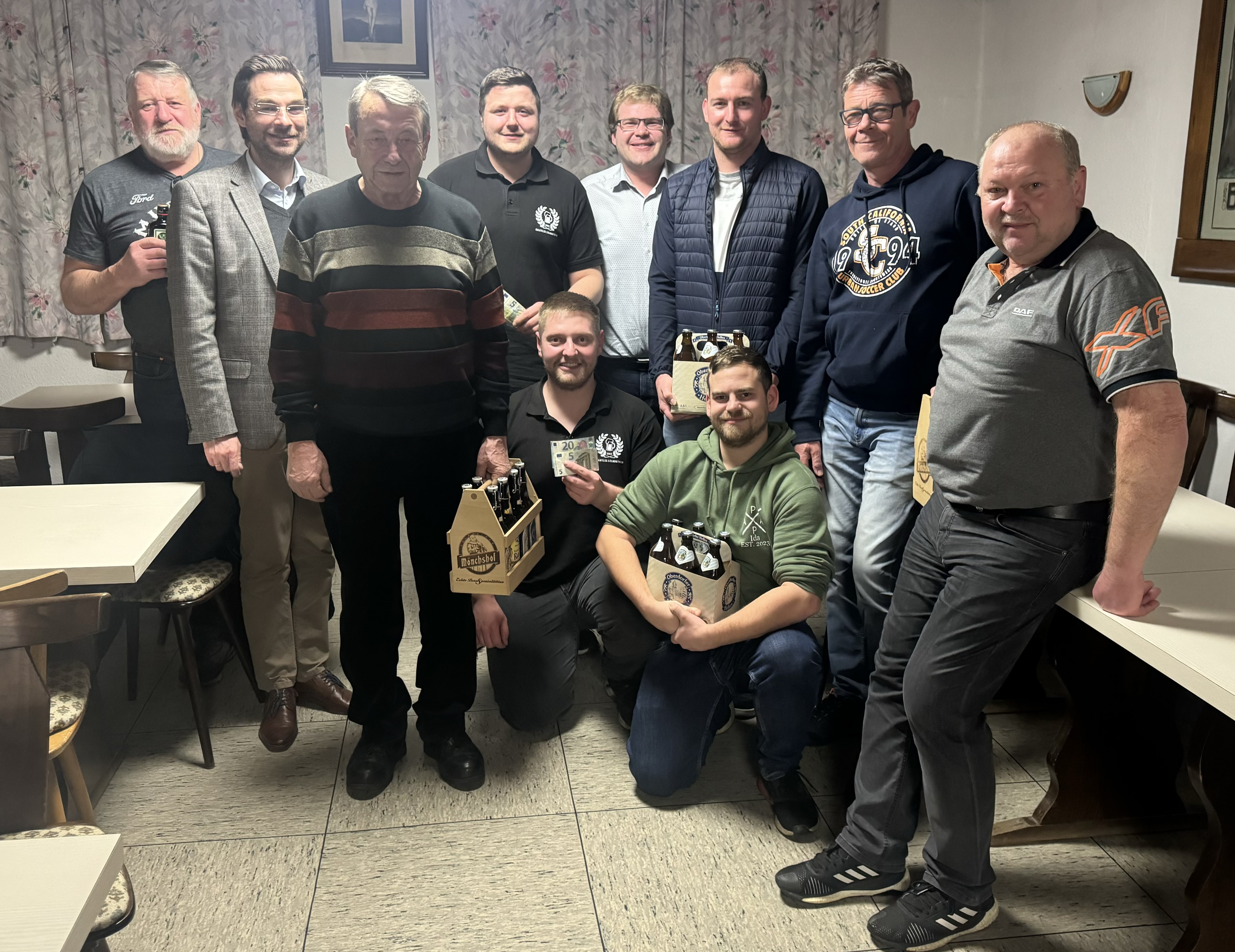 Die Organisatoren Christoph Müller (hinten Mitte) und Hubert Schiller (rechts) belohnten die neuen Watterkönige Christian Schmid (4. v. l.) und Max Scholz (unten links) mit einem Preisgeld von 50,00 Euro.