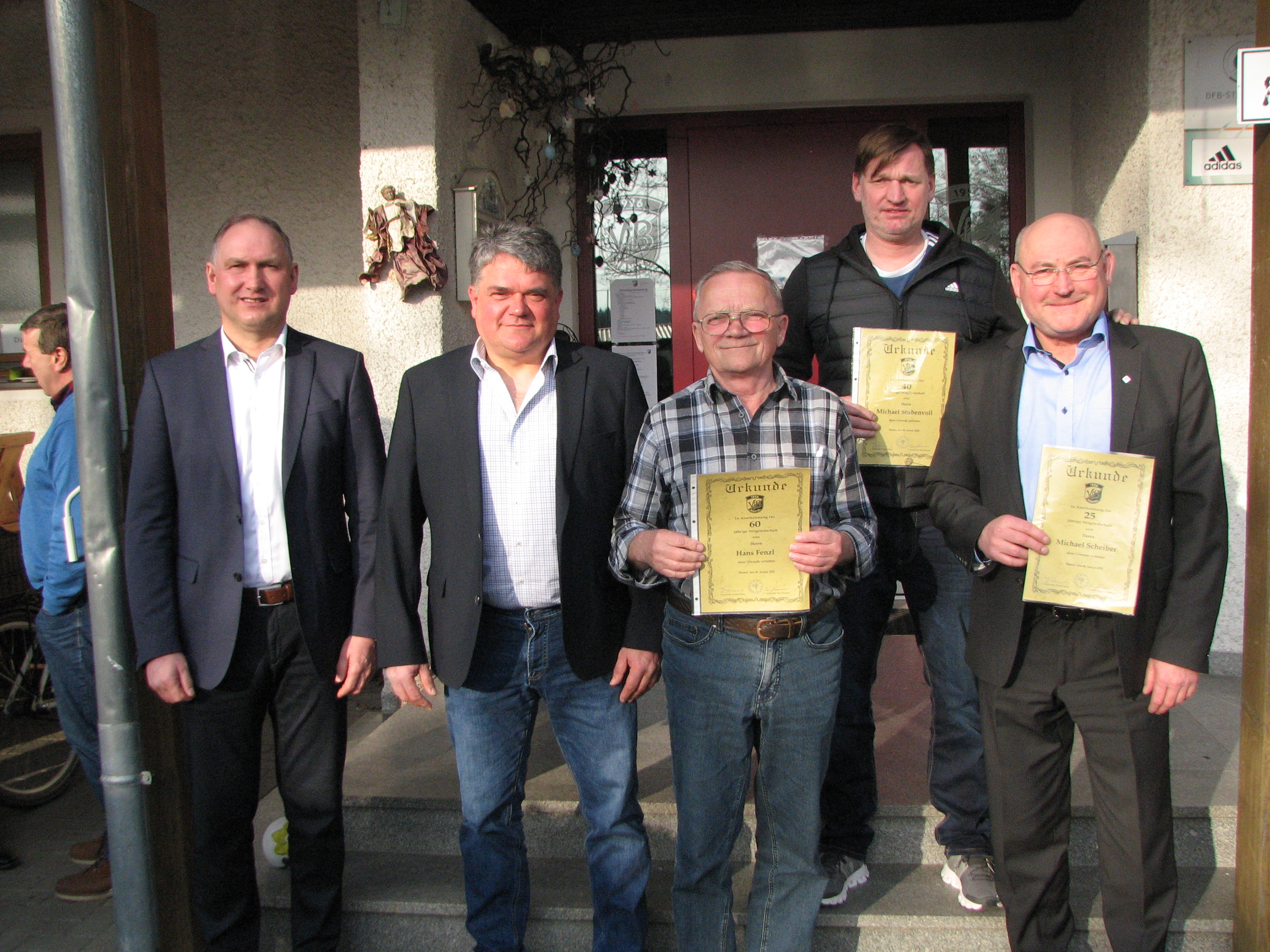 Gemeinsam mit dem Ehrenamtsbeauftragten Dominik Gößl nahm Paulus die Ehrungen für langjährige Mitgliedschaft vor. Für 25-jährige Treue zeichneten sie Michael Scheiber mit silberner Ehrennadel und Urkunde aus. Die goldene Ehrennadel mit Urkunde erhielt Michael Stubenvoll für 40 Jahre Treue. Eine Urkunde für 60 Jahre Zugehörigkeit wurde Hans Fenzl überreicht. Auszeichnungen für 25 Jahre werden nachgereicht an André Bertelshofer, Markus Fenzl, Wolfgang Kraus und Monika Prölß, für 40 Jahre an Franz Jany, für 50 Jahre an Max Fleischmann und für 70 Jahre an Max Hofmann.