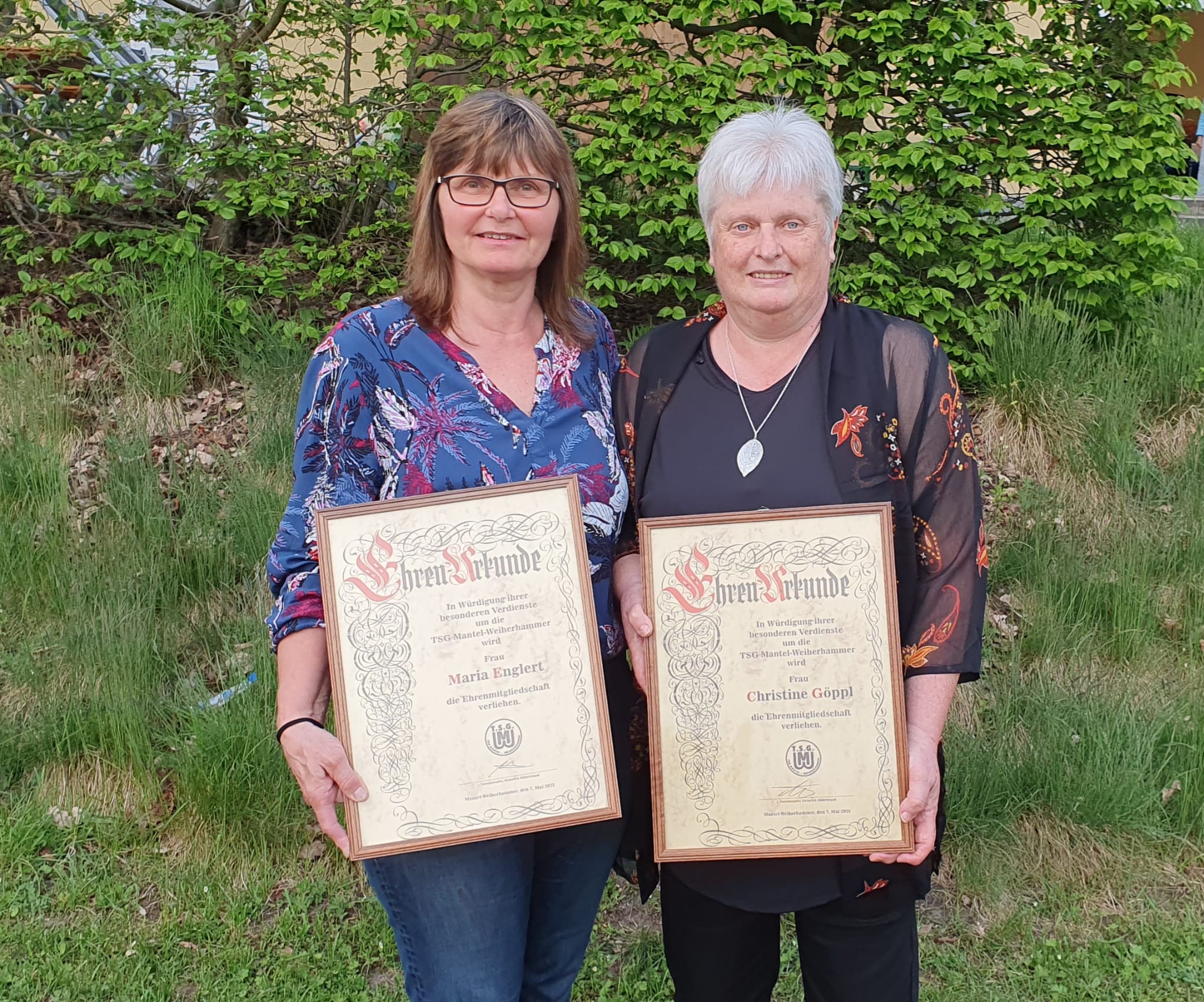 Maria Englert und Christine Göppl (von links) sind neue Ehrenmitglieder der TSG Mantel-Weiherhammer